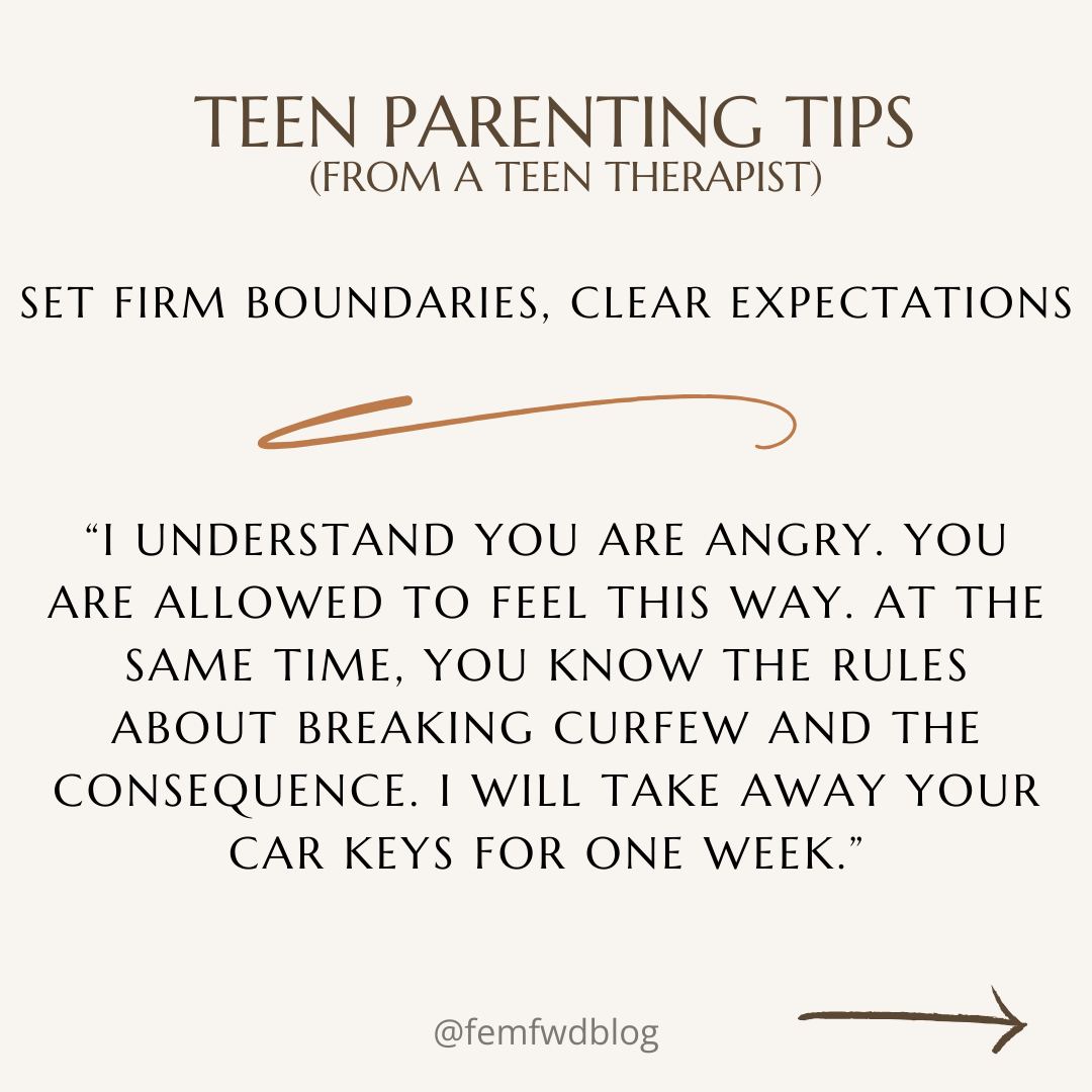 Wonder how to validate emotions and set boundaries? Here is an example, “I understand you are upset and mad, I see this and hear you. I understand this is hard because I will not given in and let you go to the party.” Let’s take this a step farther with validating emotions, implementing consequences, and reinforcing boundaries. “I understand you are pissed off at me. You are allowed to feel this way. At the same time, you know the rules about breaking curfew and the consequence. I will take away your car keys for one week.”